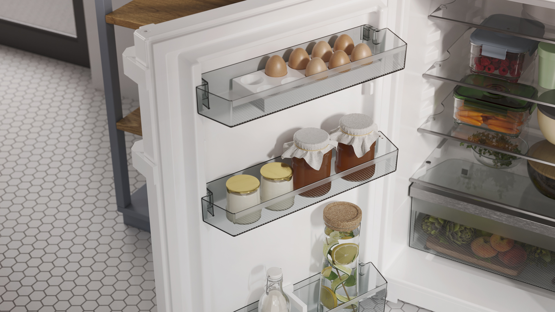 Boczne oświetlenie LED oświetla wnętrze z boku, zapewniając dobry przegląd produktów. Kolejna cecha: diody LED są umieszczone przed szklanymi półkami, dzięki czemu nawet pełna lodówka jest dobrze oświetlona.