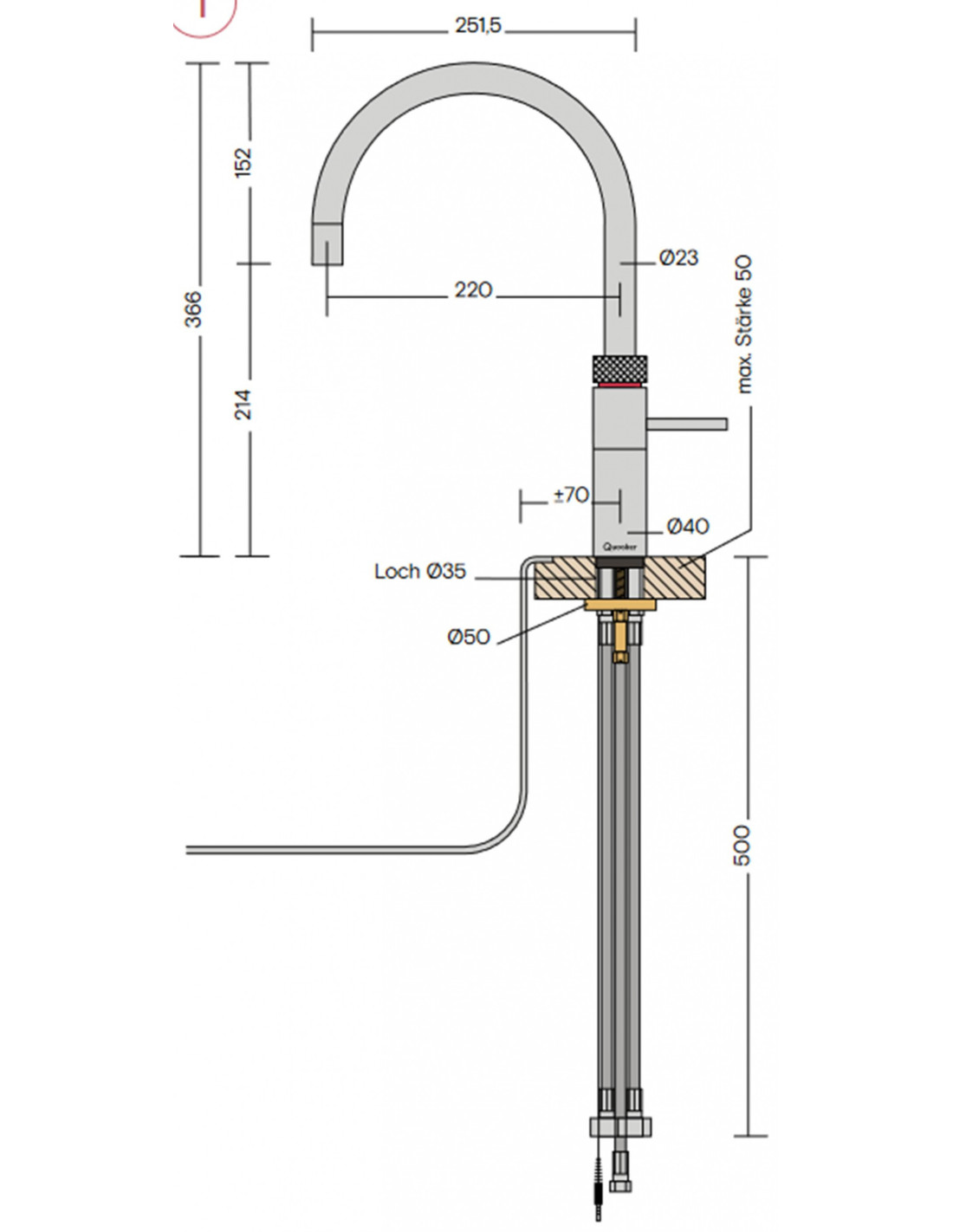 Podłączenie do sieci wodociągowej jest proste: między zaworem kątowym a wężem zimnej wody baterii mieszaczowej wkręca się trójnik. Trójnik zawiera zawór redukcyjny, który zapewnia stałe ciśnienie wody w zbiorniku. Dzięki temu innowacyjnemu systemowi firma Quooker pokazuje, jak inteligentne mogą być rozwiązania.